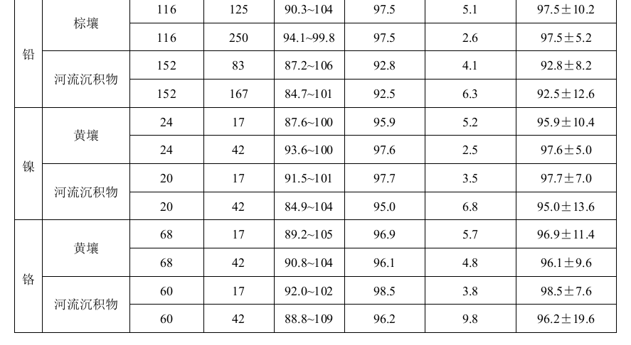 六家實驗室分別對加標量為125 mg/kg和250 mg/kg的含鉛為116 mg/kg的棕壤樣品進行了6次重復測定:加標回收率范圍分別為90.3%~104%和94.1%~99.8%,加標回收率最終值分別為97.5%±10.2%和97.5%±5.2%。六家實驗室分別對加標量為83 mg/kg和167 mg/kg 的含鉛為152 mg/kg的河流沉積物樣品進行了6次重復測定:加標回收率范圍分別為87.2%~106%和84.7%~101%,加標回收率最終值分別為92.8%±8.2%和92.5%±12.6%。
