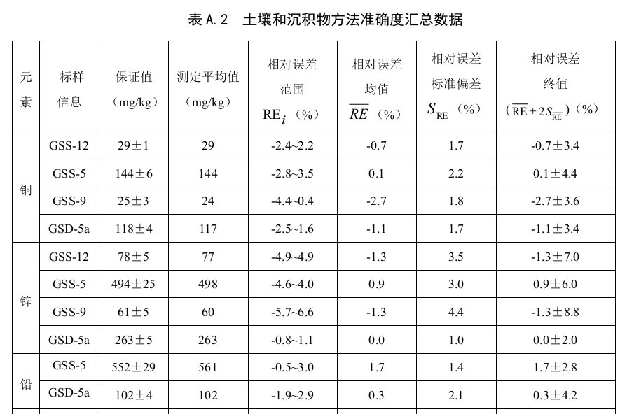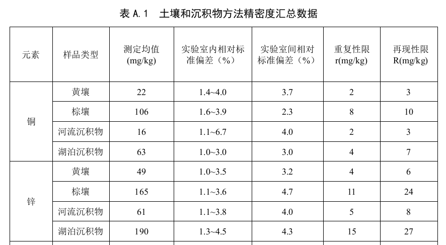 家實驗室對不同類型的土壤和沉積物統一樣品進行了測定,方法的重復性和再現性等精密度數據見表A.1。