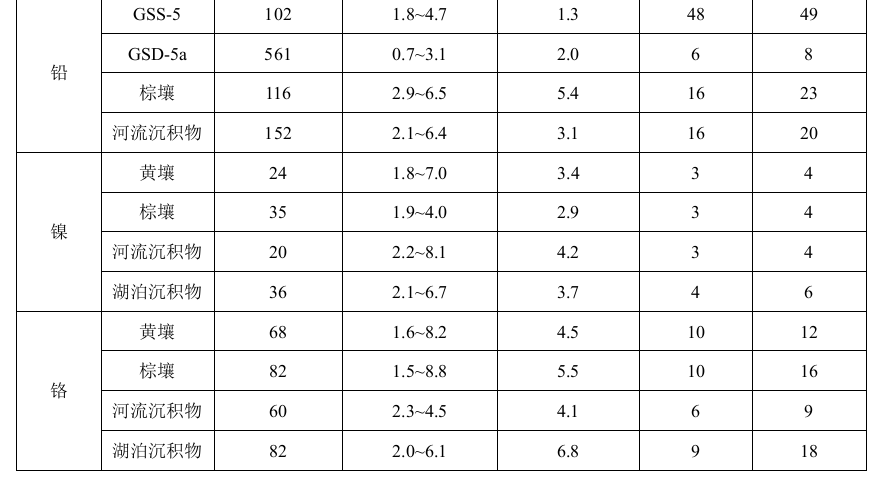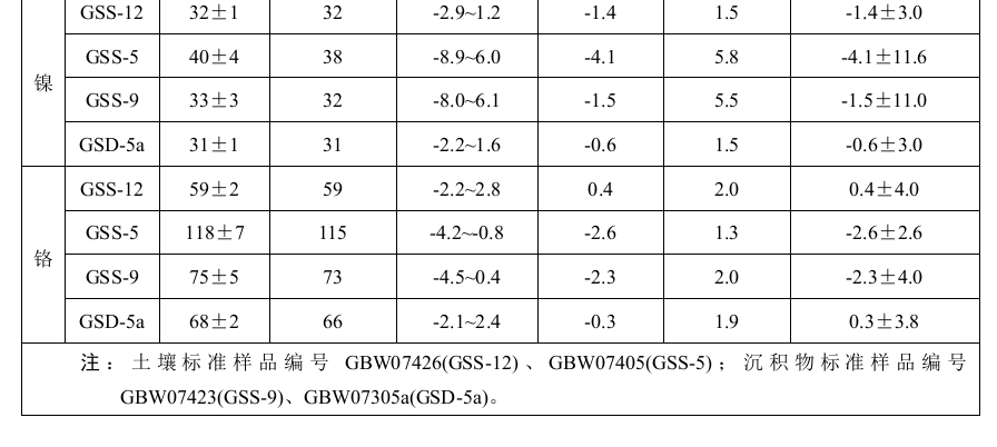 六家實驗室分別對有證標準樣品GSS-5和GSD-5a中的鉛進行了6次重復測定:相對誤差范圍分別為-0.5%~3.0%和-1.9%~2.9%;相對誤差最終值分別為1.7%±2.8%和 0.3%±4.2%。 六家實驗室分別對有證標準樣品GSS-12、GSS-5、GSS-9和GSD-5a中的鎳進行了6次重復測定:相對誤差范圍分別為-2.9%~1.2%、-8.9%~6.0%、-8.0%~6.1%和-2.2%~1.6%;相對誤差最終值分別為-1.4%±3.0%、-4.1%±11.6%、-1.5%±11.0%和-0.6%±3.0%。 六家實驗室分別對有證標準樣品GSS-12、GSS-5、GSS-9和GSD-5a中的鉻進行了6次重復測定:相對誤差范圍分別為-2.2%~2.8%、-4.2%~-0.8%、-4.5%~0.4%和-2.1%~2.4%;相對誤差最終值分別為0.4%±4.0%、-2.6%±2.6%、-2.3%±4.0%和0.3%±3.8%。
