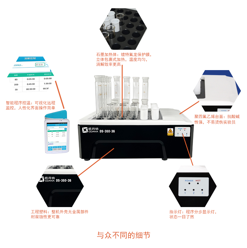樣品前處理時間占整個分析測試時間約70%,DS-360石墨消解儀36孔樣品處理量,有效提高消解效率,節(jié)約前處理的等待時間,因而在發(fā)達(dá)國家的農(nóng)業(yè)、食品、環(huán)境、疾控、科研等領(lǐng)域得到廣泛使用。