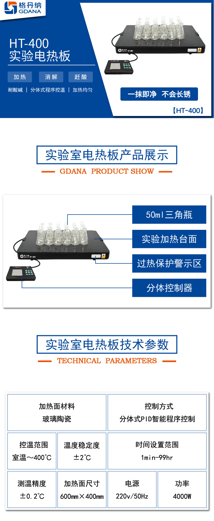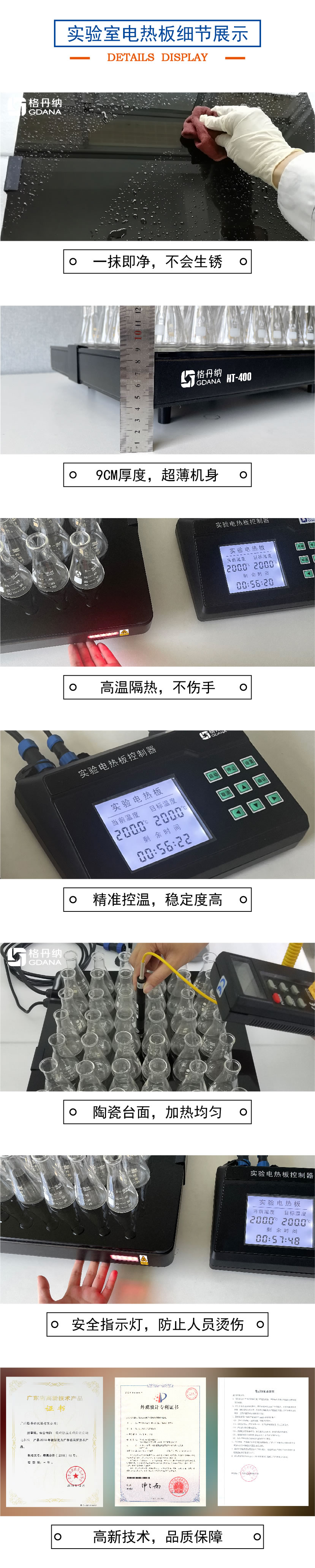 HT-400陶瓷加熱板專用于無(wú)機(jī)化學(xué)元素分析時(shí)對(duì)各類(lèi)樣品作加熱、消煮、趕酸用的恒溫加熱裝置。臺(tái)面具有耐酸堿,不生銹等特性;分體PID程序數(shù)顯控溫,是實(shí)驗(yàn)室樣品預(yù)處理好助手。