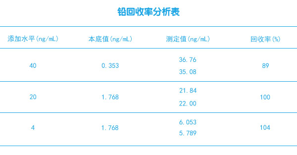 通過對11個空白的測定,以3倍空白的標準偏差所對應的濃度值表示,方法檢出限為2.1ng/mL。精密度以在相同條件下測定的6次啤酒所得值的相對標準偏差表示,為8.3%。為了驗證方法的實用性,利用建立的整套方法分析不同樣品中鉛的含量及回收率(見表格回收率測定結果)。