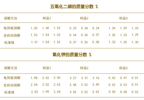 按照不同的濃度要求吸取不同量的磷、鉀標(biāo)準(zhǔn)溶液分別置于7個50mL容量瓶中,加水定容,得到不同濃度系列的全磷全鉀混合標(biāo)準(zhǔn)溶液系列。將有機肥料樣品1號、2號、3號樣品分別采用電熱板消解、全自動石墨消解儀消解,采用ICP-OES分別對樣品進行三次讀數(shù)。有機肥料中的五氧化二磷及氧化鉀(以烘干基計)平均質(zhì)量分?jǐn)?shù)測定結(jié)果見表。