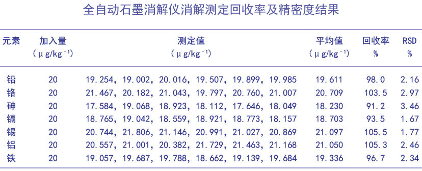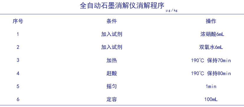 《中國藥典》中有規定了中藥中鉛、鎘、砷、汞、銅的檢測方法,對于沙星類抗生素中的其它金屬元素殘留未作規定。本文采用全自動石墨消解儀酸消解方法對樣品進行前處理消解,測定左氧氟沙星膠囊中鉛、鉻、砷、鎘、錫、鋁、鐵7大金屬元素含量。消解儀高程度自動化消解,操作簡單、批處理量大,解放人力繁瑣操作,大大提高工作效率。