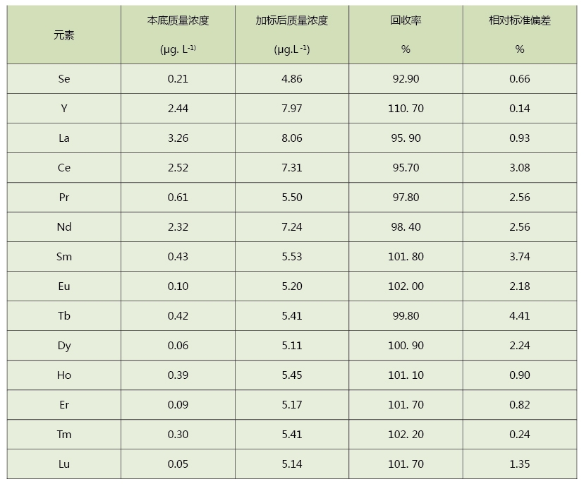 從表中可以看出,使用該方法消解茶葉測定其中的稀土含量,具有很好的回收率和精密度,加標(biāo)回收率和精密度(RSD)分別為92.9%~110.7%和0.24%~4.41%,實(shí)驗(yàn)結(jié)果滿足要求,該方法可靠,同時適用于其它植物類的應(yīng)用。
