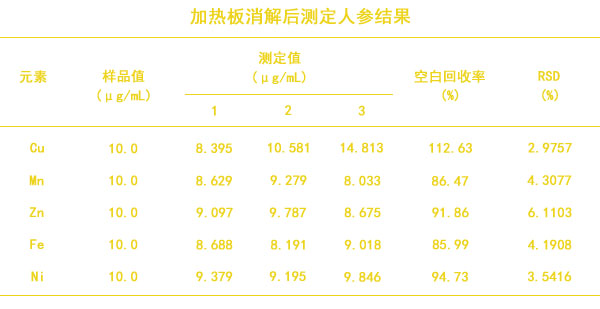 從結果可以看出消解的方法效果較好。測定人參中重金屬元素含量時實驗室陶瓷加熱板消解處理適用。